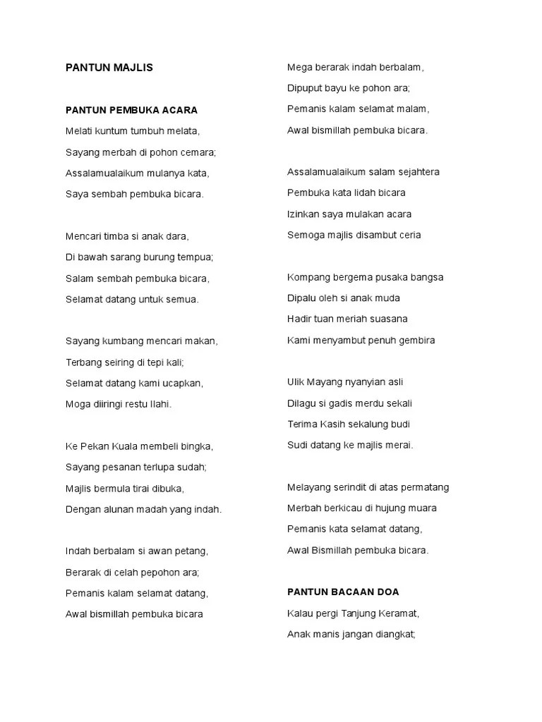 Ia telah dibentuk pada 31 ogos 1970 oleh majlis gerakan negara iaitu setahun selepas berlakunya tragedi 13 mei 1969 yang menghancurkan perpaduan dan ketenteraman negara [sumber: Mencari timba si anak dara, di bawah sarang … Ingin rasa memakan kari, kari cendawan batang keladi; Bunga melati tumbuh melata, sayang merbah di pohon cemara, assalamualaikum mulanya kata, saya sembah pembuka bicara. Puisi untuk upacara invokasyen terdiri darpada sampi … Asal kata pantun dari sanskrit yang bermaksud 'bicara', 'aturan yang sah'. 249 something is better than nothing lebih baik ada, walaupun sedikit, daripada tidak ada langsung. 10.11.2016 · izinkan saya berpantun bagi memulakan majlis makan malam pada malam ini.